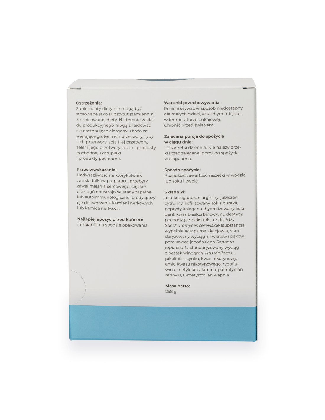 Składniki: alfa-ketoglutaran argininy, jabłczan cytruliny, liofilizowany sok z buraka, peptydy kolagenu (hydrolizowany kolagen), kwas L-askorbinowy, nukleotydy pochodzące z ekstraktu z drożdży Saccharomyces cerevisiae (substancja wypełniająca: guma akacjowa), standaryzowany wyciąg z kwiatów i pąków perełkowca japońskiego Sophora japonica L., standaryzowany wyciąg z pestek winogron Vitis vinifera L., pikolinian cynku, kwas nikotynowy, amid kwasu nikotynowego, ryboflawina, metylokobalamina, palmitynian retinylu, L-metylofolian wapnia.