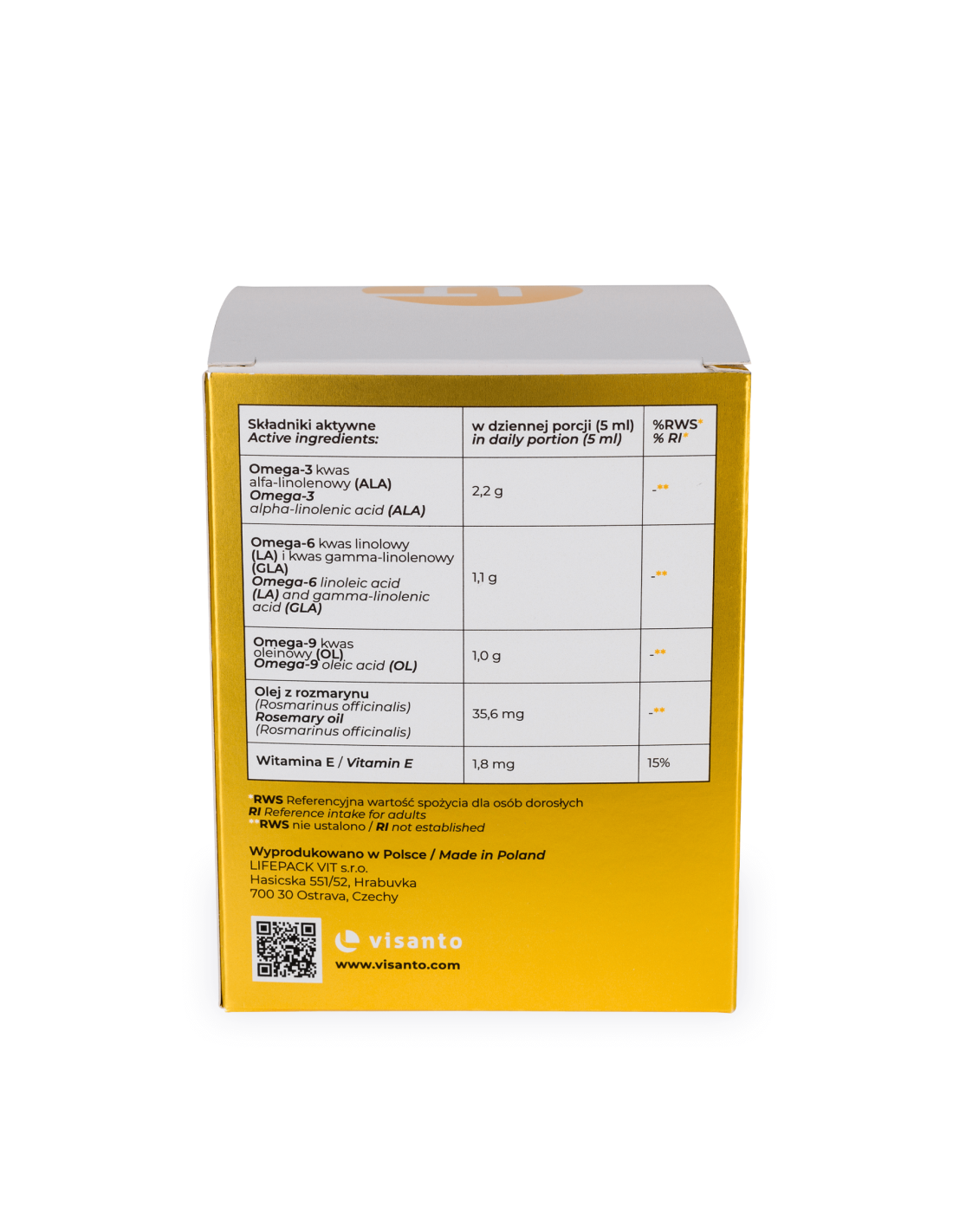 Visantol zawiera estry etylowe niezbędnych nienasyconych kwasów tłuszczowych (NNKT) Omega 3,6,9 w postaci płynnej, wyizolowane z tłoczonych na zimno olejów roślinnych (lnianego, ogórecznika, wiesiołka, czarnej porzeczki). Uzupełnia codzienną dietę w niezbędne kwasy tłuszczowe Omega 3,6,9, dostarczając je w odpowiedniej proporcji.
